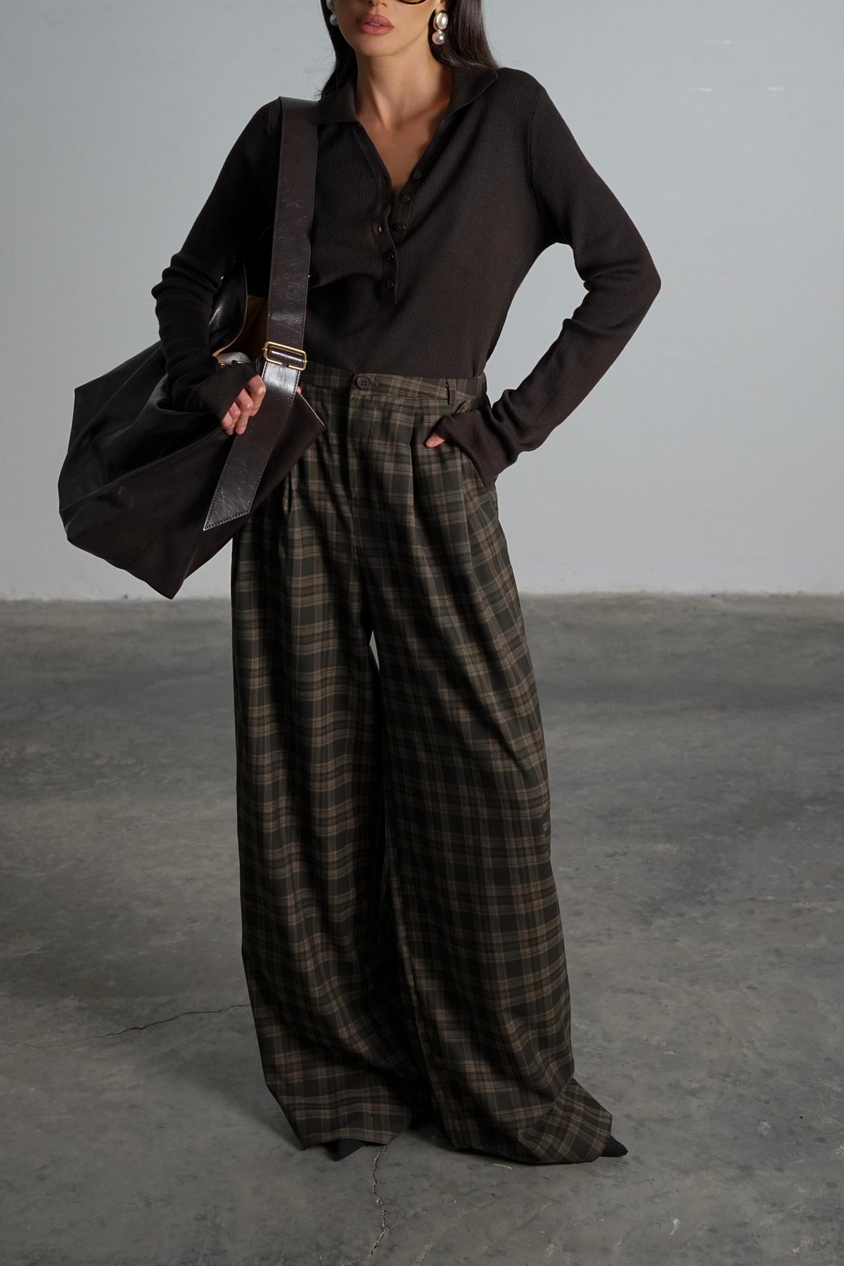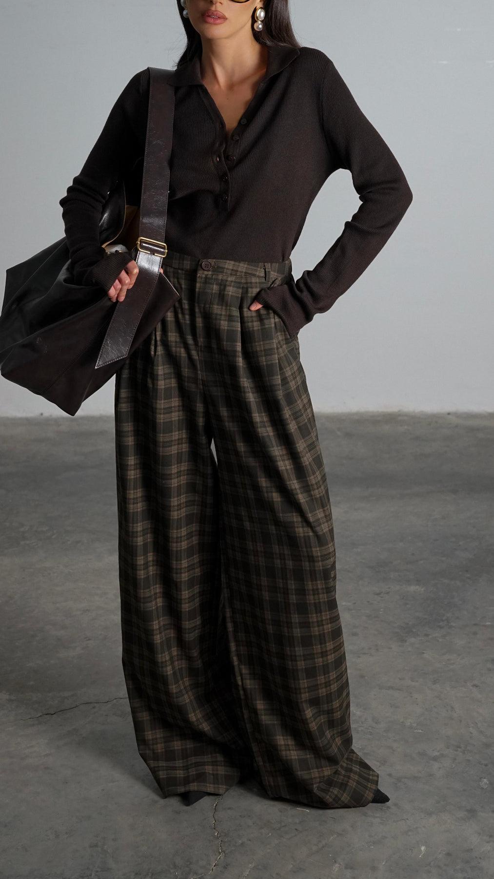 מכנסים רחבים הדפס משבצות בגווני חום-שחור